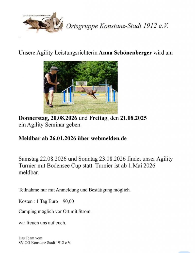 Am Samstag, 22.08.2026 und Sonntag, den 23.08.2026, wird der Hundesportplatz wieder zum Austragungsort des Agility-Bodensee-Cups. Meldbar ab 01.05.2026 in webmelden.