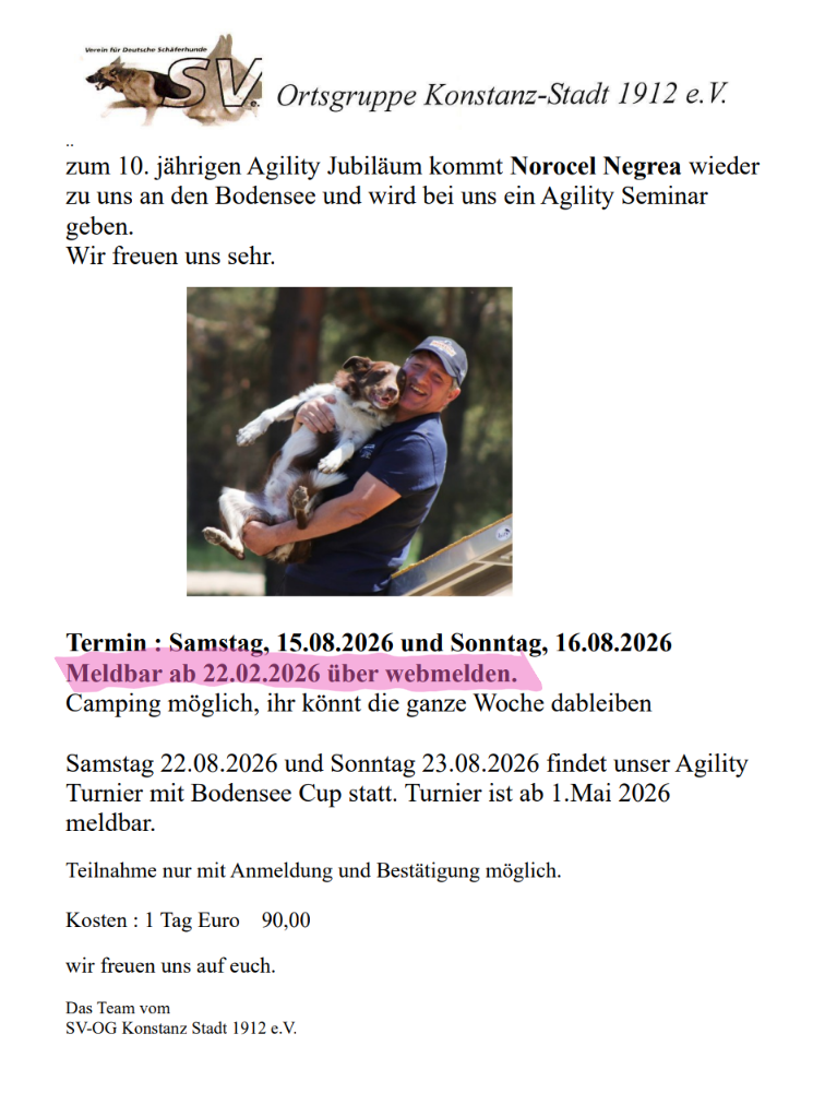 Am Samstag, 22.08.2026 und Sonntag, den 23.08.2026, wird der Hundesportplatz wieder zum Austragungsort des Agility-Bodensee-Cups. Meldbar ab 01.05.2026 in webmelden.